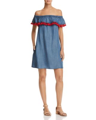 Aqua藍色綴紅邊露肩裙 (Tassel Off-the-shoulder Chambray Dress-100% Exclusive)
